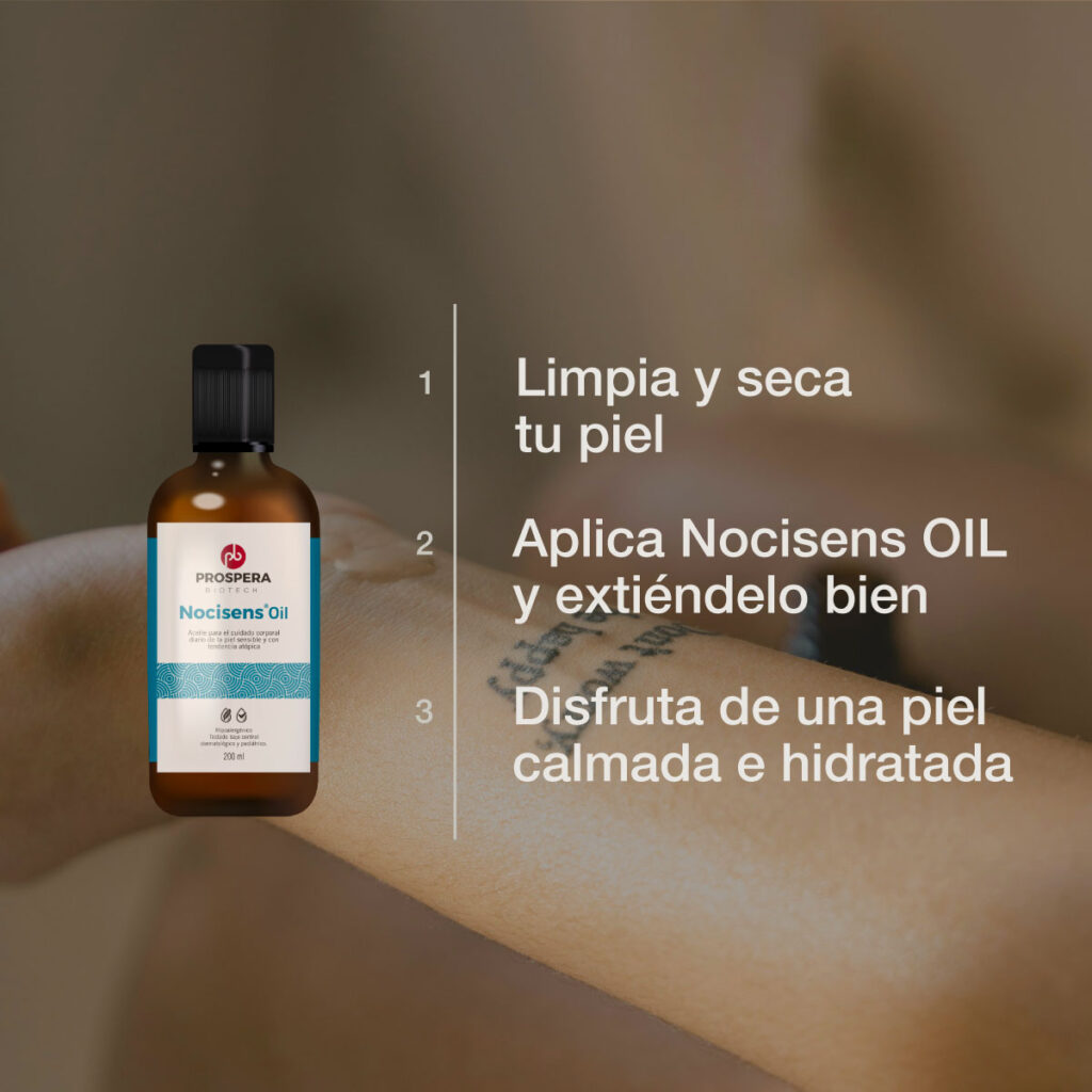 - Hidrata y nutre profundamente tu piel con productos emolientes para cuidar o reparar la barrera cutánea, como Nocisens® Oil.