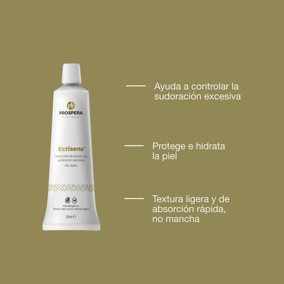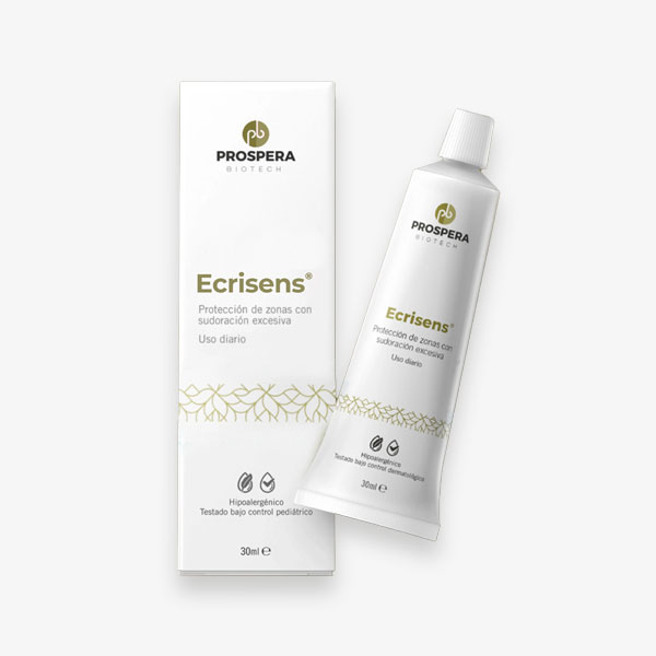 Investigación llevada a cabo por el IDIBE-UMH ha identificado las causas de la sudoración excesiva. Prospera Biotech se ha basado en esos estudios para desarrollar una innovadora fórmula que combina la acción de ingredientes neuromoduladores para el control de la sudoración excesiva (Ecrisens®). El uso continuado de Ecrisens® ayuda progresivamente a controlar la sudoración excesiva protegiendo la barrera natural de la piel y aportando una sensación de suavidad duradera. Su textura tipo gel se absorbe fácilmente, incluso en áreas húmedas o con sudoración, dejando la piel suave y sedosa. Ecrisens® ha sido diseñada para mantener la acción termorreguladora de la sudoración, conservando el grado de sudoración necesario para proteger la piel del calor excesivo. Ecrisens® no es un anti-transpirante de acción rápida, sino un producto que actúa progresivamente para reestablecer el equilibrio adecuado entre sudoración y protección térmica de la piel.